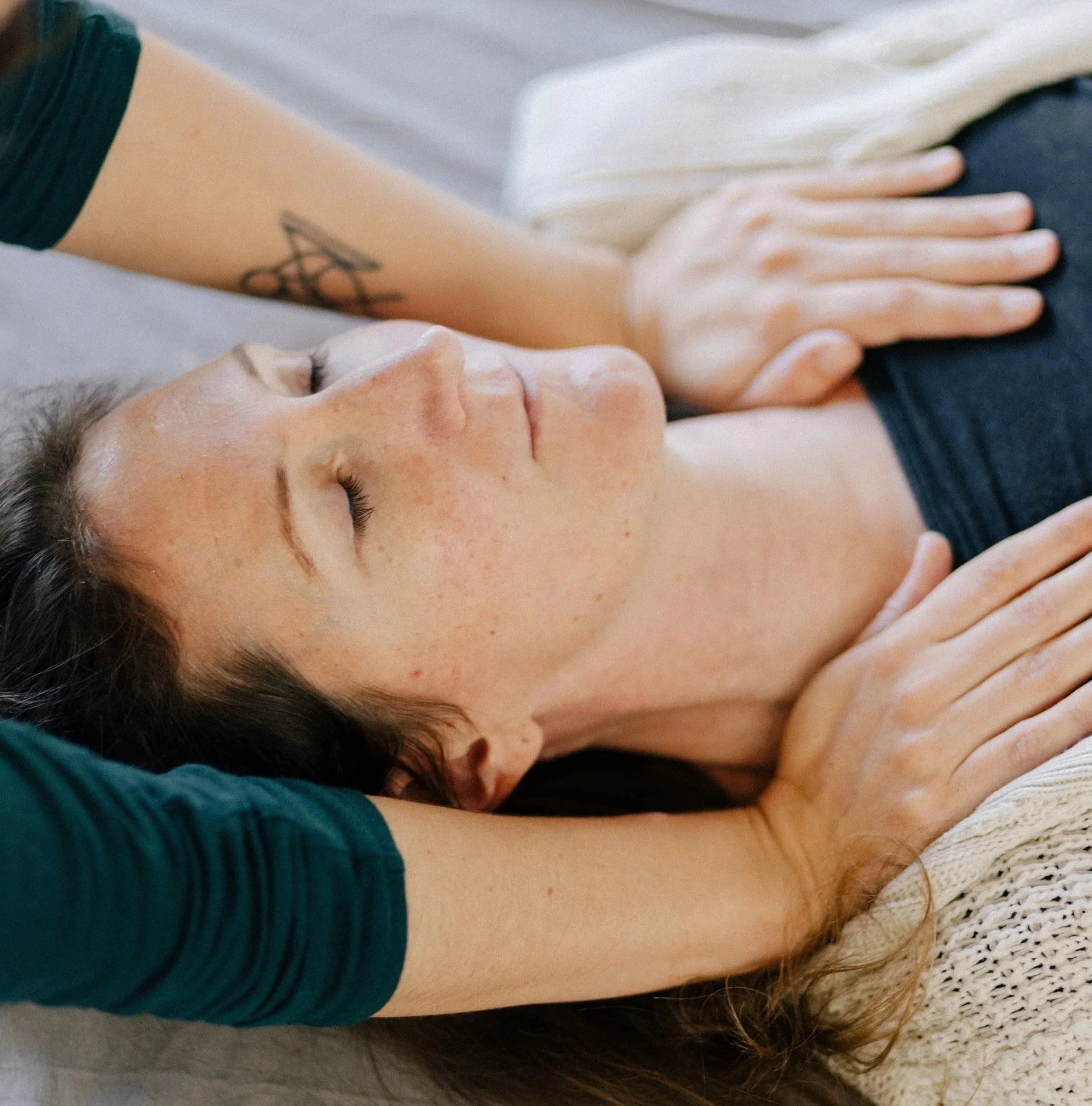 The hands-on portion (for in-person Berlin sessions) involves empathetic touch that communicates directly with your nervous system. You remain fully clothed throughout. Through touch, I can sense areas of tension, disconnection, or activation, and guide you toward feeling these patterns while supporting your system's natural capacity to shift when it feels ready.